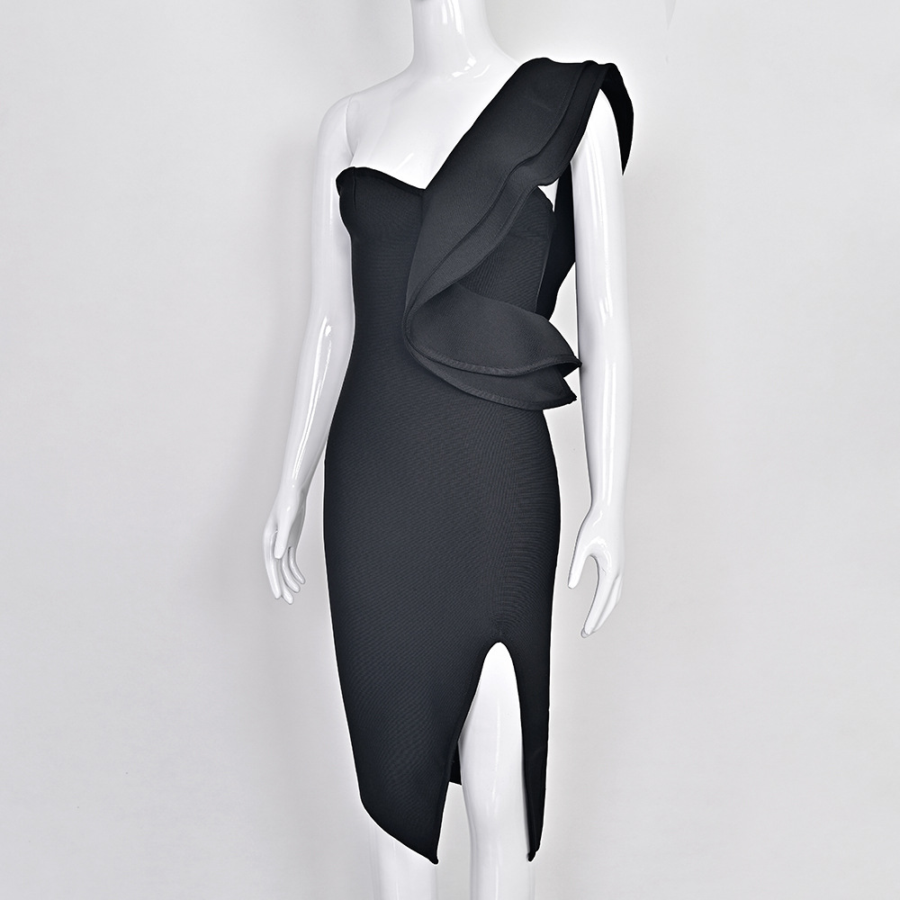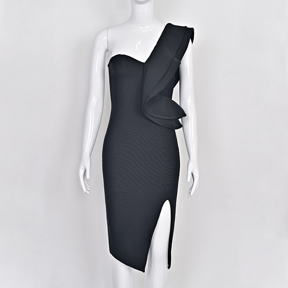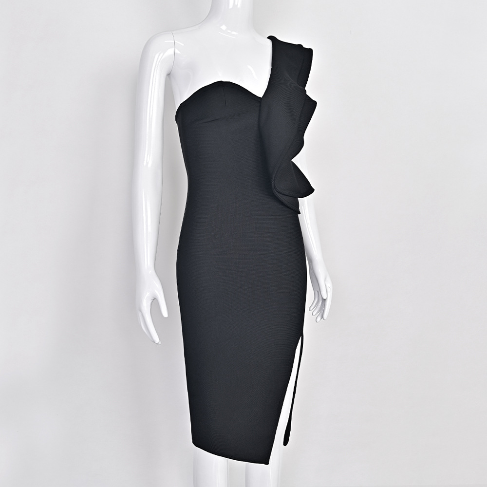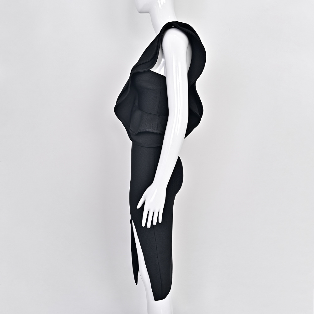Style: One-shoulder, high waist, mid-length skirt with slit