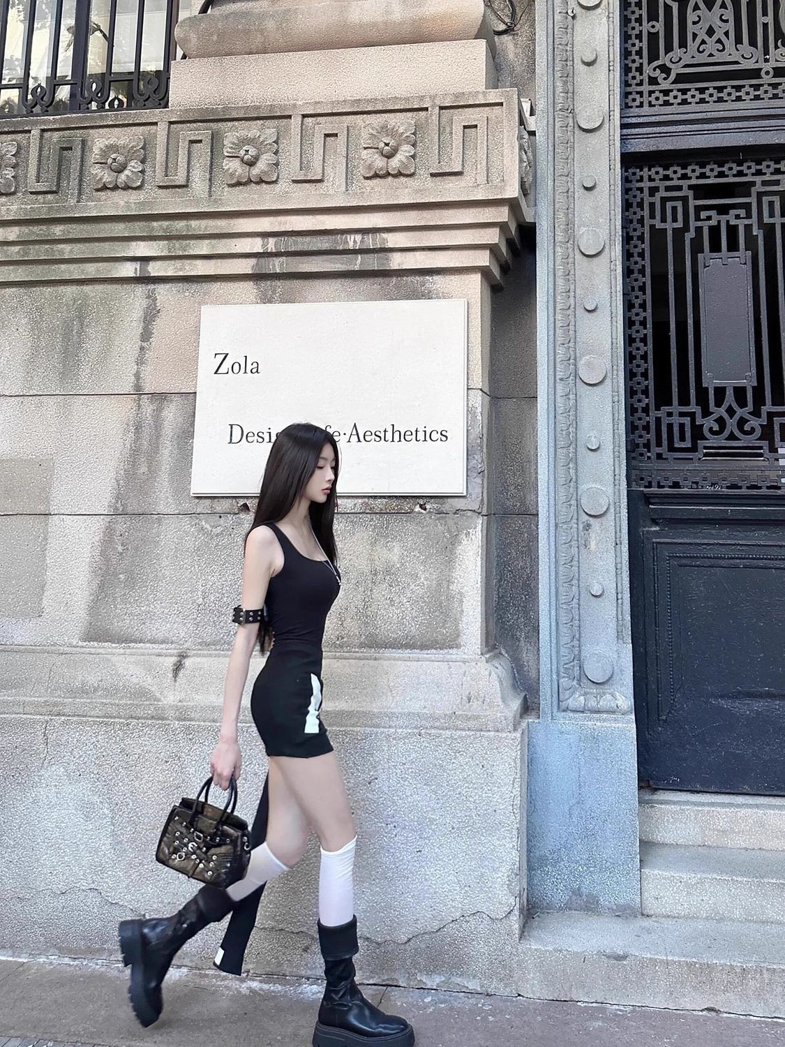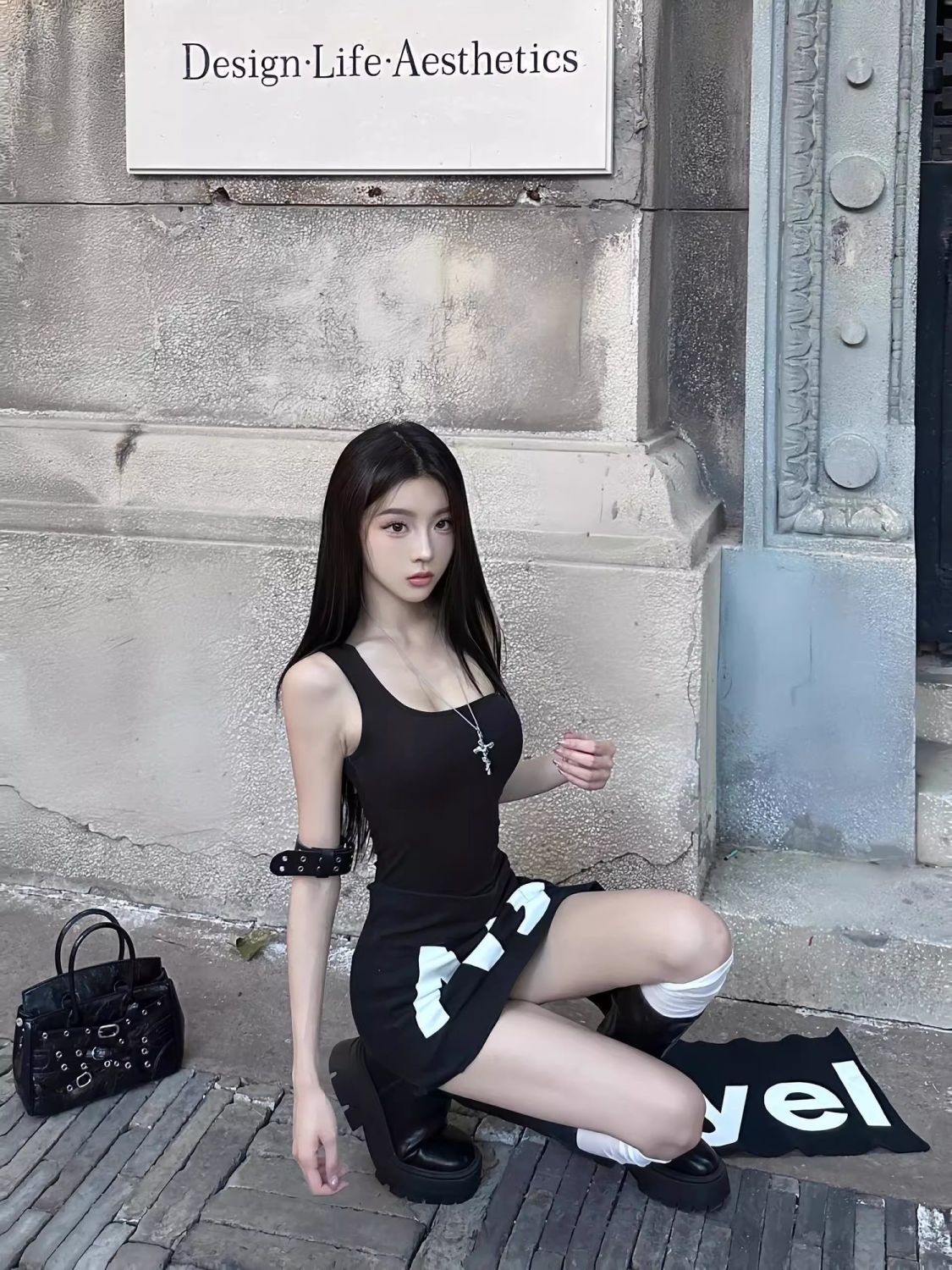 Style: Square collar, sleeveless, hip-hugging short skirt.